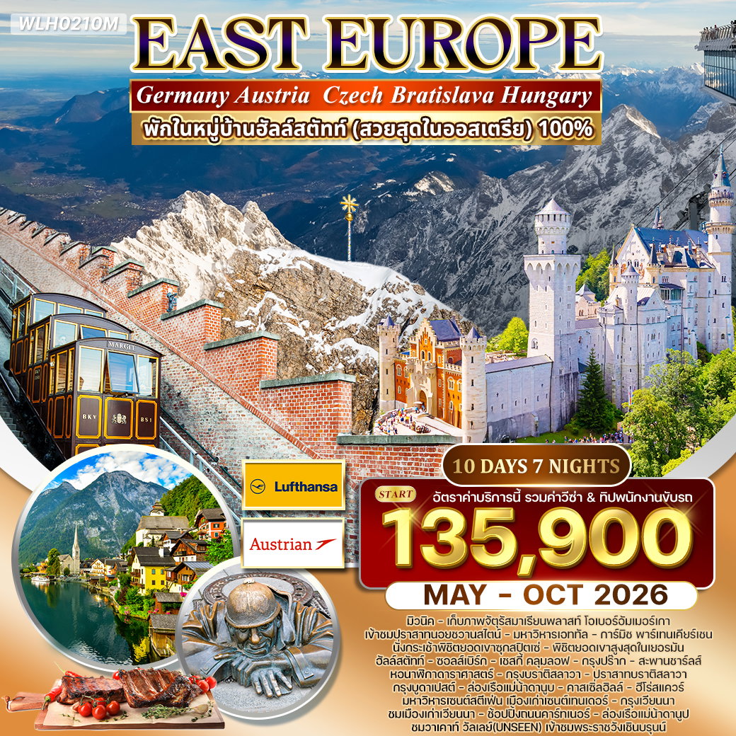 มื้อพิเศษ : ขาหมูเยอรมัน – ปลาเทร้าท์ย่างฮัลล์สตัทท์ – เป็ดโบฮีเมียน – ฮังกาเรียนกูลาซ – ซี่โครงหมูอบสไตล์เวียนนา – ดินเนอร์ล่องเรือแม่น้ำดานูบ