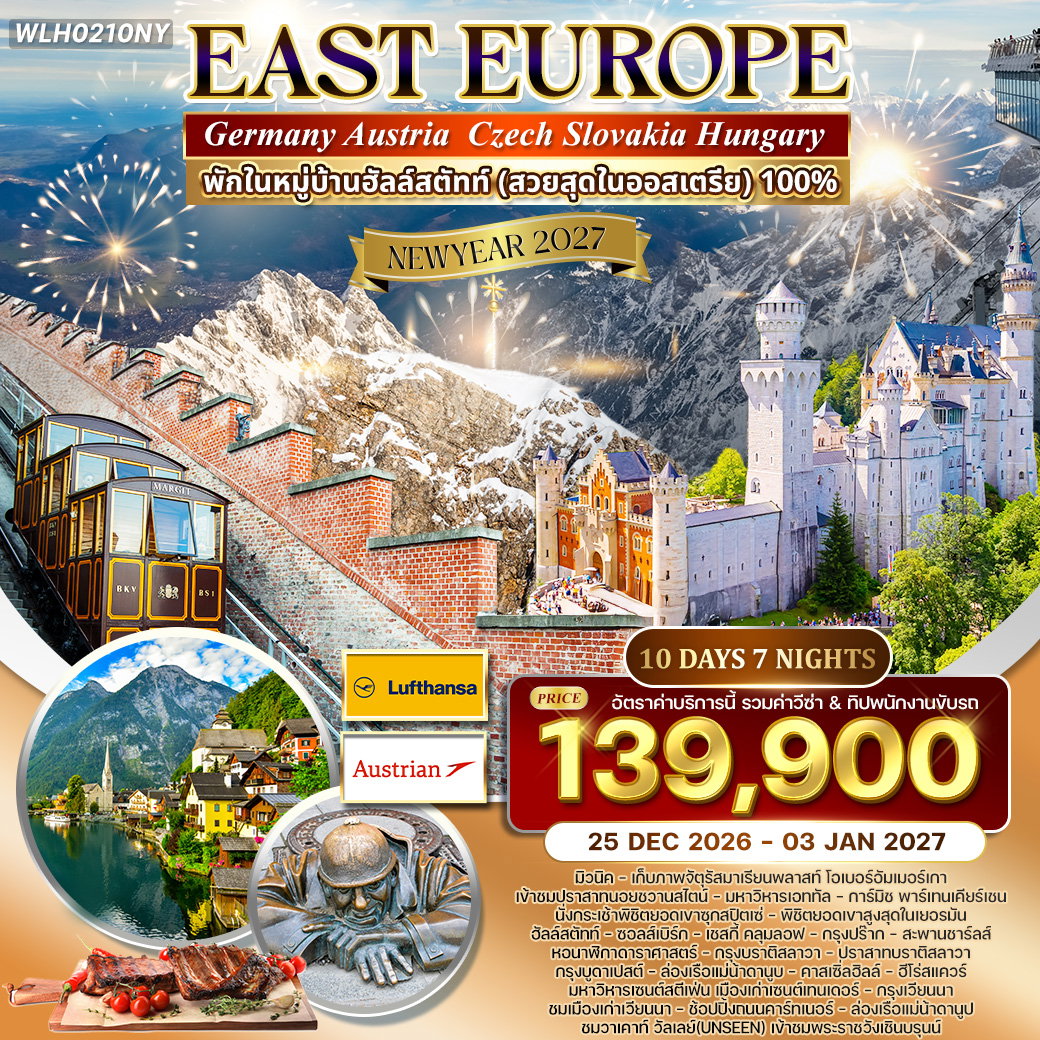 มื้อพิเศษ : ขาหมูเยอรมันพร้อมเบียร์ – ปลาทราวท์ย่างฮัลล์สตัทท์ – ดินเนอร์ฮังกาเรียนกูลาซ – ดินเนอร์วิวแม่น้ำดานูบ – ดินเนอร์ฉลองปีใหม่ที่บูดาเปสต์